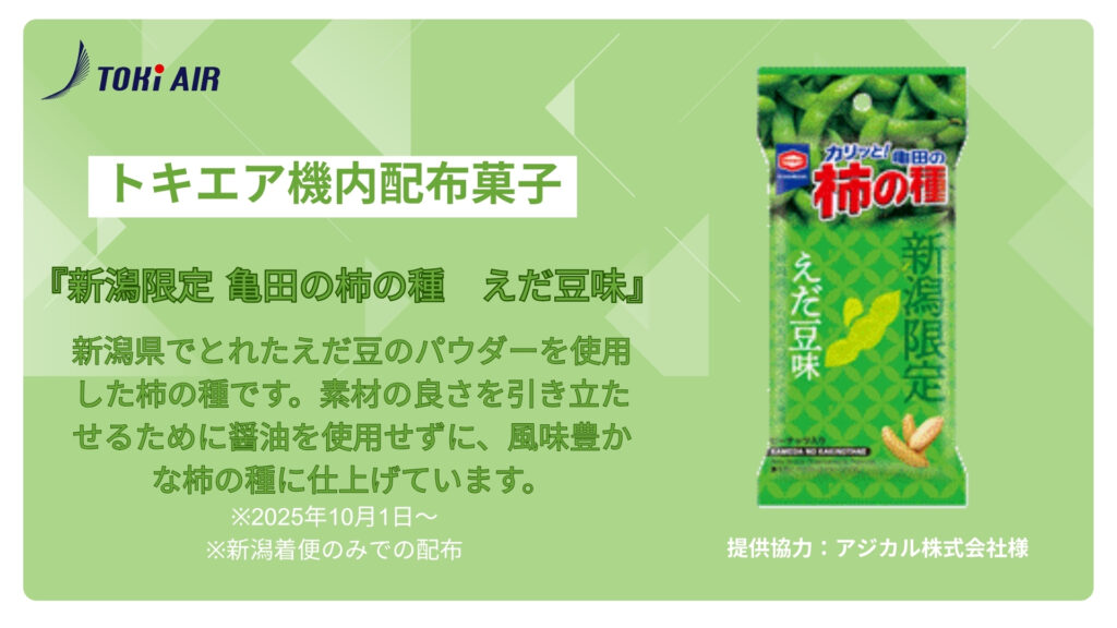 2025.10.02 機内配布菓子について 新潟拠点の地域航空会社トキエア株式会社(本社:新潟県新潟市 代表取締役:長谷川政樹、和田直希、以下トキエア)は2025年10月1日からの機内配布菓子についてお知らせいたします。今回ご提供するお菓子は「新潟限定 亀田の柿の種 えだ豆味」です。 作付面積日本一の新潟県産の「えだ豆」パウダーを、素材の良さを生かす塩だれベースの柿の種にあわせて、風味豊かに仕上げました。新潟での限定販売商品です。 ※気象条件・運航状況・機材繰りなどの理由でサービス提供できない場合がございます ※ご提供は、新潟空港着の路線が対象となります。 ※アレルギー:乳・落花生・ごま・大豆・鶏肉 ※商品情報 新潟限定 56g 亀田の柿の種 えだ豆味|アジカル株式会社 – 亀田製菓(株)グループ トキエア株式会社について 社名:トキエア株式会社 (英文名 TOKI AIR Co., Ltd.) 設立:2020年7月 代表者:代表取締役 長谷川 政樹、和田 直希 本社所在地:新潟県新潟市東区松浜町3710番地 新潟空港ターミナル1F 事業内容:航空運送事業 URL:https://tokiair.com/ トキエアは「革新的なモビリティサービスを通じて地域産業の活性化を目指す 」をビジョンに掲げ、2020年に創業した新潟拠点の地域航空会社です。地球環境にやさしく脱炭素・運航コストを削減するATR 72-600/ATR42-600などのプロペラ機を使用し、「新潟=札幌(丘珠)」「新潟=名古屋(中部)」「新潟=神戸」線を運航、人やモノを運ぶことを通じて ビジネス・観光・インバウンドなどあらゆる地域創生に貢献しています。 公式SNSで最新情報、キャンペーン情報等も随時発信中 X(旧Twitter):https://twitter.com/tokiair_pr Instagram:https://www.instagram.com/tokiair/ Facebook:https://www.facebook.com/tokiair/ LINE:https://lin.ee/4TNAjkt TOKI AIR オンラインストア:https://tokiair.official.ec/ Discord:https://discord.gg/jdRsszPahM 報道関係からのお問い合わせ 広報担当 /pr@tokiac.com 一覧へ戻る